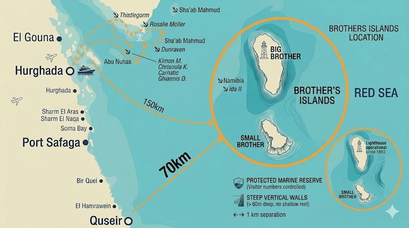The Brothers Islands sit in the Egyptian Red Sea, approximately 70km east of El-Quseir and 150km south of Hurghada. They’re designated as a protected marine reserve under the Egyptian Environmental Affairs Agency — visitor numbers are controlled, and only licensed liveaboard operators can obtain the permits required to dive there.