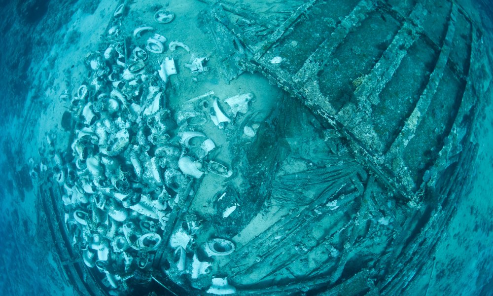 The cargo is the thing: the Yolanda was carrying bathroom fittings. Toilets, bathtubs, and pipes are scattered across the reef, half-encrusted in coral.