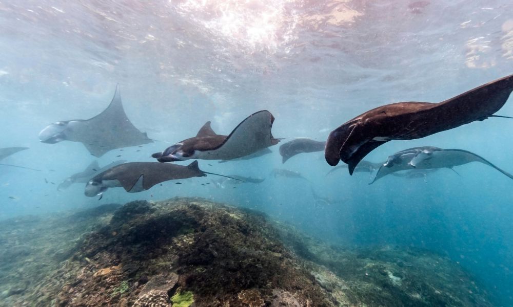 I’ll remember my first dive at Manta Point for the rest of my life. It was September — my wife Shannon was with me — and we dropped into crystal clear water not knowing quite what to expect. What we got was somewhere between 30 and 40 manta rays working the cleaning station simultaneously. I have the footage. When I say it stopped us both dead in the water, that’s not an exaggeration. The sheer scale of it — these enormous animals just drifting past you metres away, completely unbothered — is the kind of dive that recalibrates what you think is possible underwater.